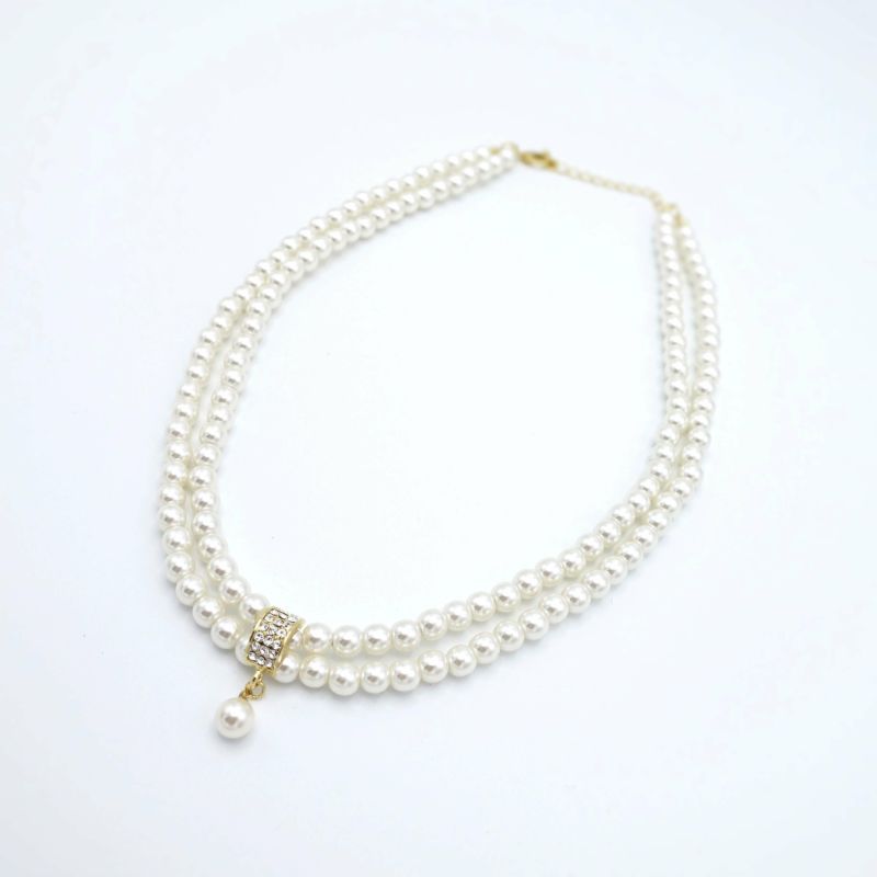 2連タイプで程よいボリューム感で、ワンポイントにキラキラと輝くストーンパーツと小粒パールが存在感を際立たせます。