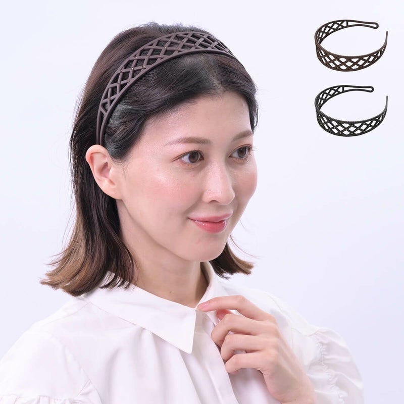 光沢を抑えたマット加工の網目デザインカチューシャです。幅広タイプで存在感も与えつつ、マットなカラーが目立ちすぎずに落ち着きのある印象で着用いただけます。キラっと光るストーンがお洒落。内側に付いた櫛でしっかりとホールドするのにも優れております。
