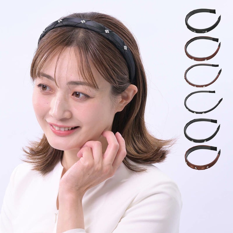 シンプルなグログランカチューシャにクロスストーンをあしらい華やかさをUPさせたカチューシャです。つけるだけで一気に大人可愛く仕上がります。幅のサイズで印象が異なるのも特徴です。