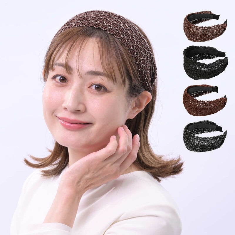 メッシュの透け感が大人のこなれ感を演出。幅広なのに軽くてストレスフリーな使い心地。さっとつけるだけで、しっかりと髪をまとめてくれます。落着きのある使いやすいカラ―は定番で長く愛用いただけます。シャインタイプはキラっと光るテープがアクセントに!お洒落感もUPします。