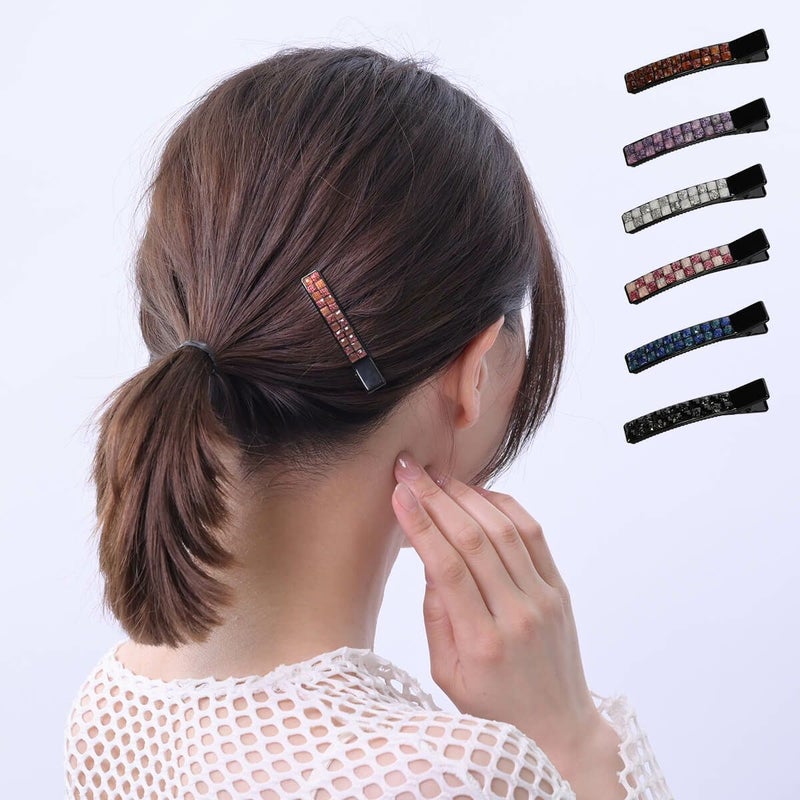 サイドやおくれ毛、前髪を留めるのに最適なミニヘアクリップ。ノーセットでも、さっとつけるだけ時短ヘアの完成。簡単に動きを出してくれるので普段の日常生活にとても重宝します。まとまりが悪いなと思ったときにもカバー出来るアイテムです。上品に輝くカット石が入ったタイプで、抱負なカラーがファッションや気分に合わせてお選びいただけます。もう少し長さが欲しいなと思ったら長めタイプもオススメです。