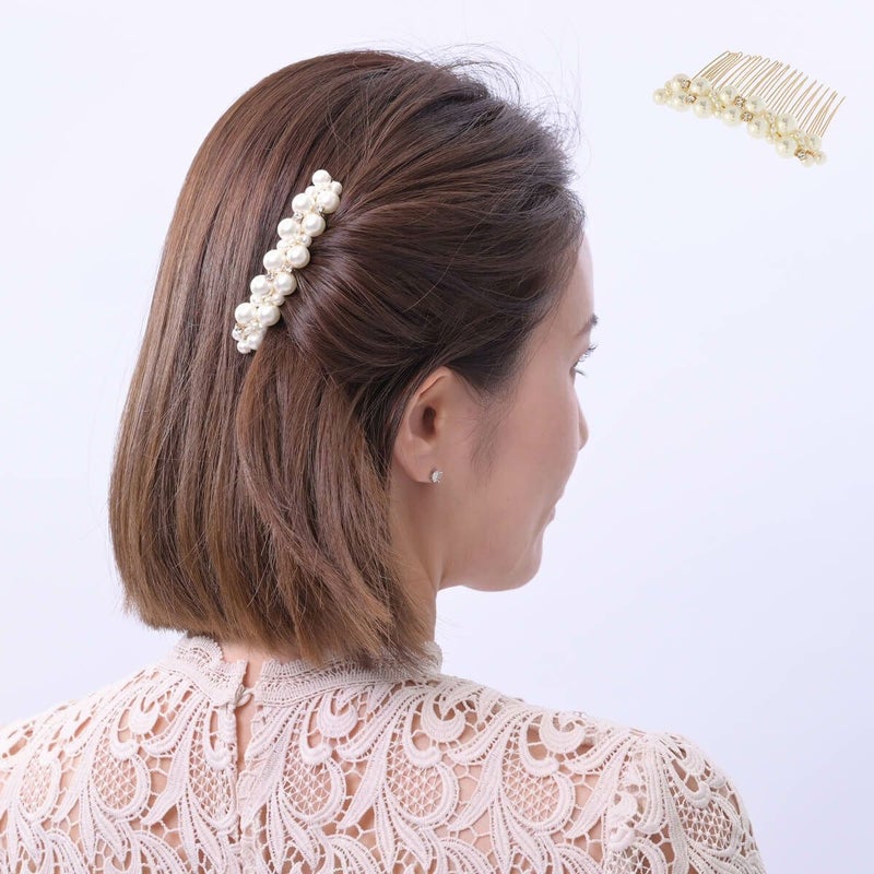 まとめ髪やサイドに挿すだけで簡単に上品なヘアスタイルの完成。アレンジヘアに添えると華やかさがUPします。使いやすいサイズ感とパールとラインストーンを編み込んだゴージャスなデザインが、よりアレンジを引き立ててくれます。結婚式やパーティーシーンにオススメの一品です。