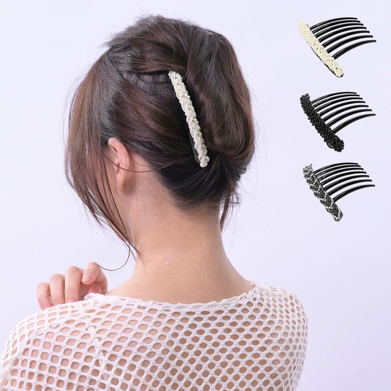 くるっとまとめてつけるだけ、簡単アップスタイル。軽く滑らかな使い心地で、絡まらずにさっとまとめやすいです。パールビーズを編込んだ高級感のあるデザインは、つけただけで上品な仕上がりにしてくれます。どんなシーンでも合わせやすいカラーとサイズ感で大人のヘアアレンジに最適です。