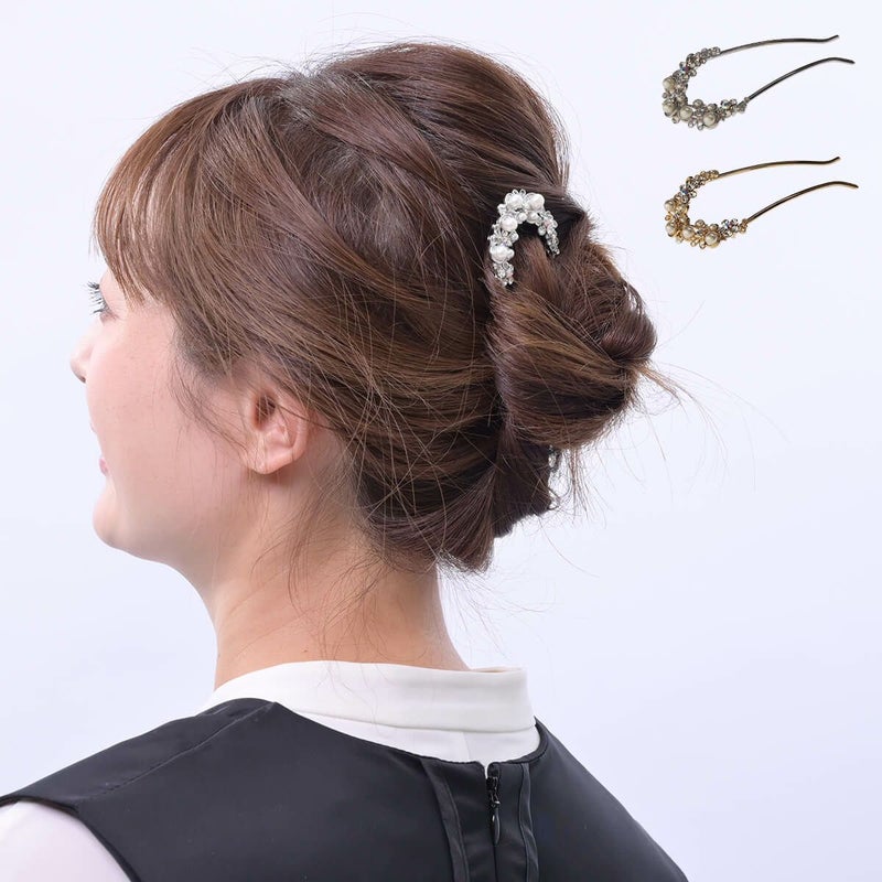 まとめ髪に一挿しするだけで華やかなアレンジスタイルに。キラキラと輝くラインストーンと蝶々モチーフのデザインが上品に華やかさを演出します。Uピンや小ぶりのコームを添えるとより華やかに。結婚式やパーティースタイルにオススメの一品です。