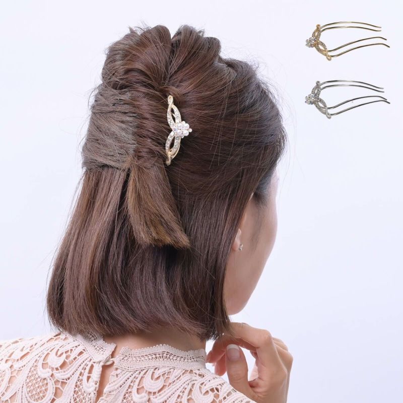 4本足のタイプでホールド力に優れており、髪の毛の多い方でも簡単にまとめ髪が叶います。しなやかな曲線と滑りのよい足がつけやすさ抜群です。ラインストーンをベースとしポイントにパールをあしらったデザインが特徴的。結婚式やパーティー、お呼ばれスタイルにオススメの一品です。
