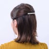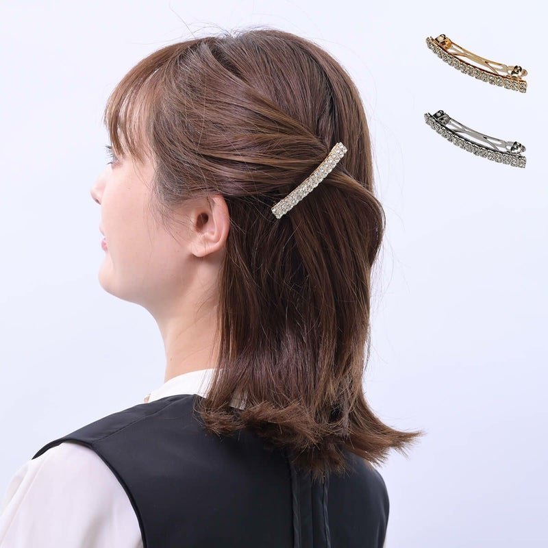 ラインストーンの輝きが美しいヘアバレッタ。存在感のしっかり出るサイズ感で、ハーフアップやまとめ髪のポイントに添えるとエレガントに仕上がります。