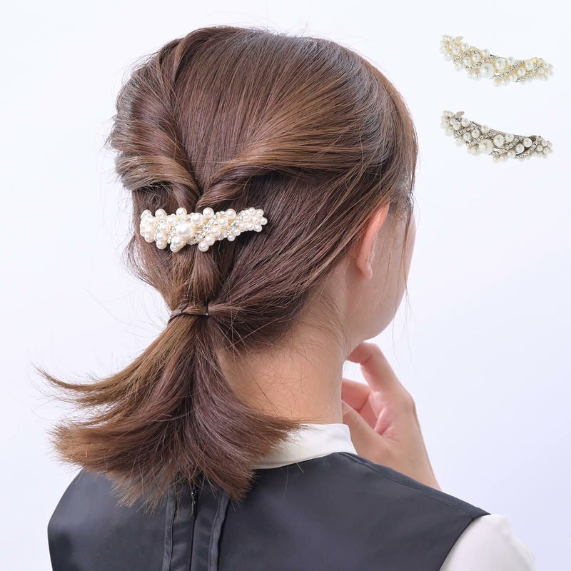 パールとラインストーンを贅沢にあしらったゴージャスなバレッタです。ハーフアップやまとめ髪につけるだけで、とても高級感があり一気に華やかなスタイルに仕上げてくれます。結婚式やパーティー、お呼ばれスタイルにオススメの一品です。